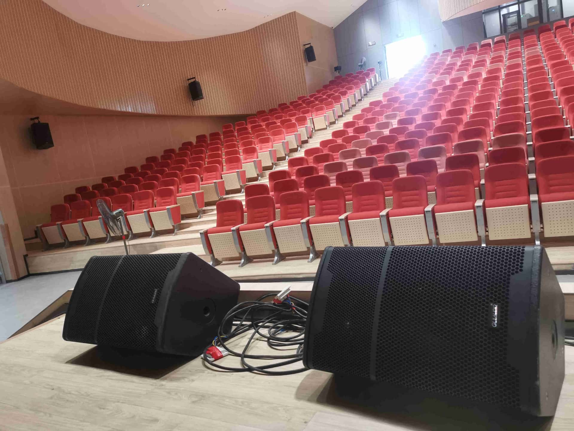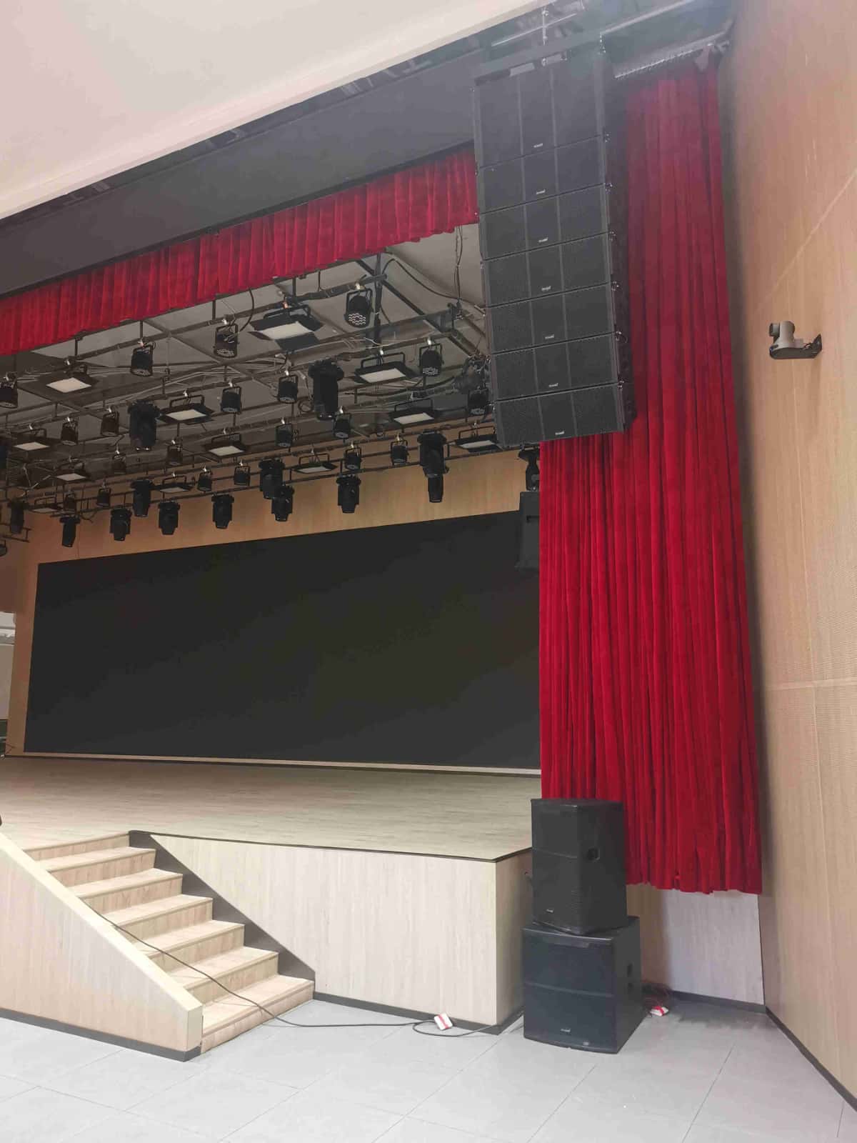 扩声系统:系统配置了12只单10寸线阵列扬声器;2只双15寸超低线阵列扬声器;2只8寸台唇全频扬声器;14只12寸辅助全频扬声器;2只15寸返送扬声器;2只单18寸超低频扬声器;全数字四通道功放10台;3台处理器,1台调音台系统处理